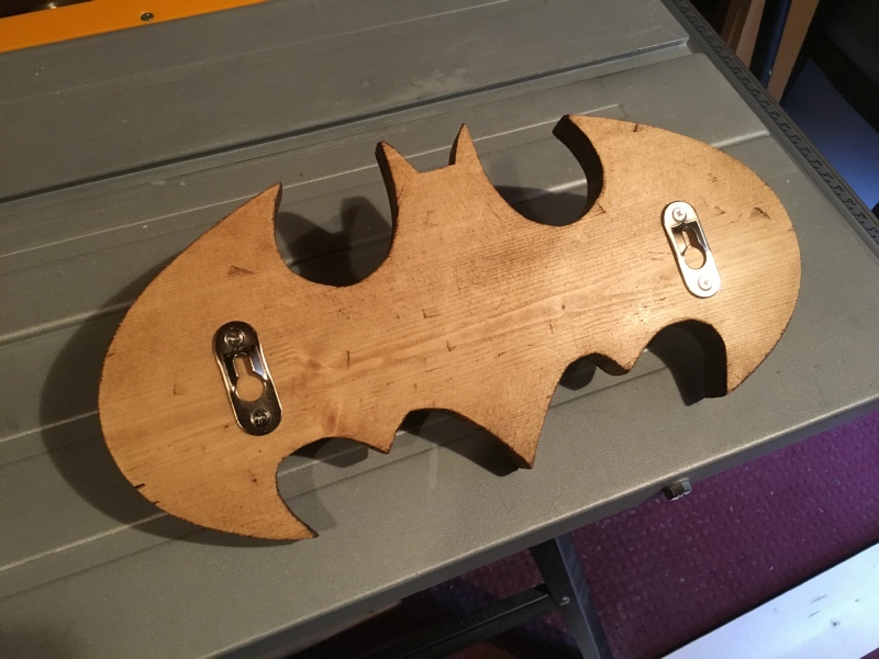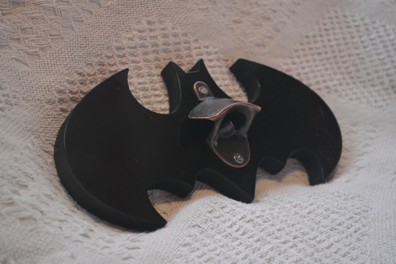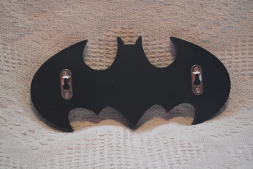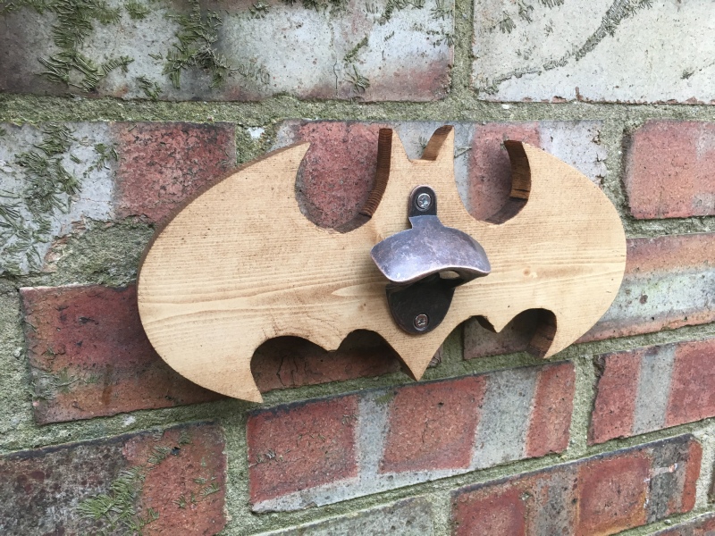 Handmade Batman wall mountable bottle opener made from solid pine. It features keyhole hangers on the back for easy wall mounting. It comes finished in dark oak wax and measures 280mm x 138mm. For interior use only.