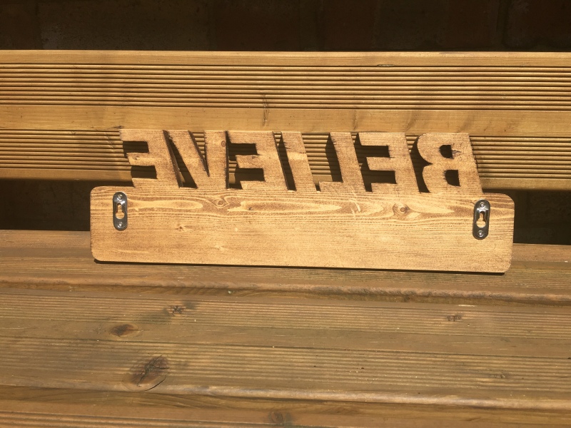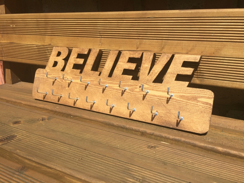 Medal hanger made from solid pine. Features 15 hooks and keyhole hangers on the back for easy wall mounting. Comes finished in dark oak wax. Measures 450mm x 145mm. Names can be cut instead of “Believe” if required.