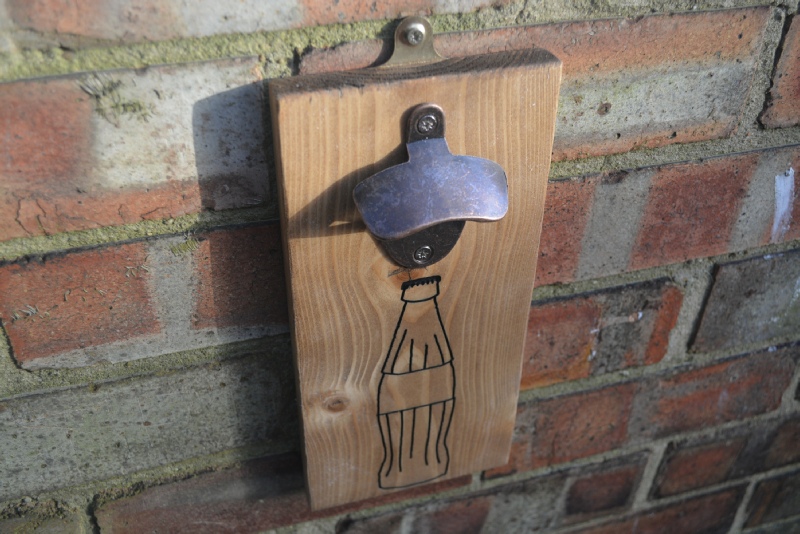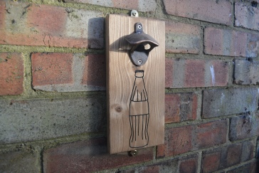 Wall mountable bottle opener with engraved bottle design. It measures 29cm top to bottom, 11.7cm wide and 4.3cm deep. The wood is finished in a dark oak wax and features metal plates for easy mounting. I can engrave a logo, name or message instead of a bottle at a cost of £5 extra if required. Black, Blue or Red paint can be used for the design.