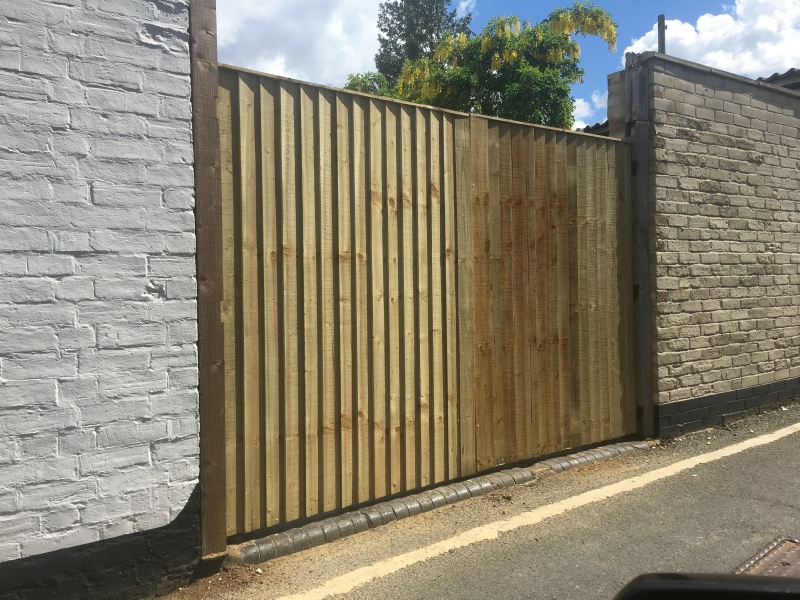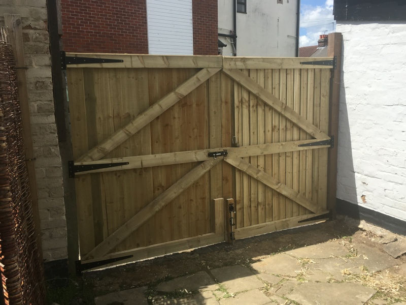 These are some pictures of two driveway gates I installed. I first had to remove a pair of old iron gates before fitting these using tee hinges, a bolt and a latch to keep one gate closed while the other can open. One gate had to be cut and planed to fit but after adjustment it fit perfectly.