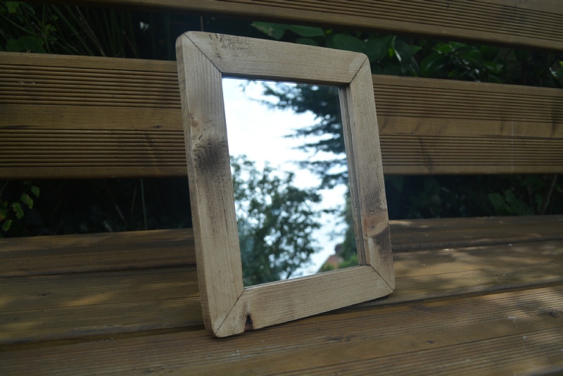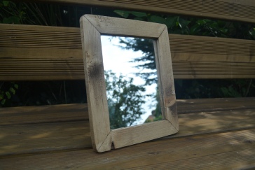 Handmade mirror finished in a dark oak wax. It measures 23.5cm high, 20.5cm wide and 7cm deep.