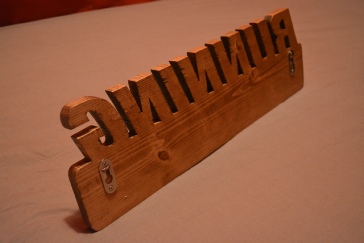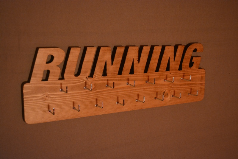 Medal hanger made from solid pine. Features 15 hooks and keyhole hangers on the back for easy wall mounting. Comes finished in dark oak wax. Measures 450mm x 145mm. Names can be cut instead of “Running” if required.