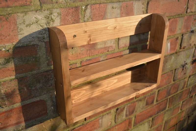 2 Tier spice rack finished in dark oak wax. Measures 37cm Wide, 25cm High and 6.5cm Deep. Comes with pre drilled holes for mounting.